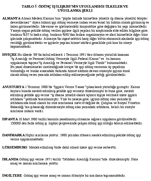 Raporda AB ülkelerindeki uygulamalara dair ise şunlar söyleniyor: Ödünç iş ilişkisi çeşitli hukuk sistemlerinde incelendiğinde, bu tür işçi istihdamının hemen her ülkede mevcut olduğu görülmektedir. Bu üçlü ilişkinin hukuki yapısında bir ülkeden diğerine az çok farklılıklar bulunmaktadır. Uygulanan tüm ülkelerde genel görüş başkasına işçi vermenin ya da diğer bir deyimle ödünç işçi istihdam edilmesinin gerek ulusal gerek uluslararası düzeyde firmaların rekabet şansını artırdığıdır. (Tablo 5).