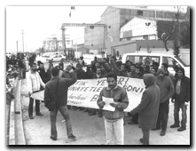 “Artık yeter! İş cinayetlerine son!/TİB /DER” yazılı pankartı açarak ajitasyon konuşmaları eşliğinde işçileri eyleme çağırdık. Bir müddet sonra pankartın arkasında toplanan yaklaşık 40 işçi “Metin Turan aramızda!”, “Direne direne kazanacağız!”, “Kahrolsun ücretli kölelik düzeni!” “Artık yeter! Ölmek istemiyoruz!” sloganlarını attı.