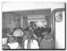 Kültür evimizin salonunu kurultay için düzenledik. “İstihdam paketine hayır! Kreş hakkımız gaspedilemez!” ve “Özgürlük ve eşitlik mücadelesinde vardık, varız, varolacağız!” pankartları ile çeşitli taleplerimizin yazılı olduğu dövizlerimizi astık.