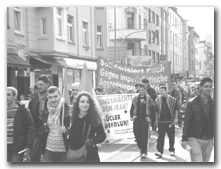 Konuşmaların ardından kortejler oluşturularak yürüyüşe geçildi. Yürüyüşte anti-faşistler “Alman askerleri Afganistan’dan, ABD Irak’tan çekilsin!” ve “Siyasal haklarımıza sahip çıkalım!” , İLPS-ATİK “Bütün işgalci güçler Irak’tan defolsun!”, MLKP “Kahrolsun emperyalist savaş ve işgal!”, İnisiyatif e.V. “Euroamerika’nın savaşına hayır!”, “Alman ordusu Afganistan’dan çekilsin!”, “Demokrasi direniş demektir!” pankartları taşındı. Yürüyüş boyunca, “Yaşasın uluslararası dayanışma!”, “Halkların uluslararası katliam merkezi ABD!”, “Katil ABD Ortadoğu’dan defol!”, “Emperyalizm yenilecek, direnen halklar kazanacak!”, “Yaşasın halkların kardeşliği!”, “Zafere kadar intifada!”, “Kadın-çocuk katili ABD ve İsrail!’’ vb.. ortak sloganlar sıklıkla atılırken, yürüyüşe hatırı sayılır bir kitle ile katılan Türkiyeli islamcı bir kesim ise sık sık “Direnişe devam, Hamas’a selam!’’ sloganları atması dikkat çekti. Yürüyüş güzergahı üzerinde birkaç kişinin İsrail bayraklarıyla gösteri yapması kısa bir gerginliğe yol açtı. Polis araya girdi. Kitle “Katil İsrail!’’ sloganlarıyla yoluna devam etti.