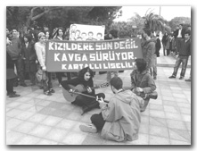 Liseli Öğrenci Birlikleri, Liseli Gençlik ve İstanbul Liseli Gençlik Platformu olarak eylemde ortaklaştık. Eylemimiz Kartal Meydanı’nda saat 16.00’da alkışlarla başladı. “Kızıldere son değil, kavga sürüyor! / Kartallı Liseliler” pankartımız ve Kızıldere şehitlerinin resimlerinin yer aldığı ozalit açıldı. Okunan basın açıklamasında, Kartal’da liseliler ve dershane öğrencileri olarak mücadeleyi sürdürdüğümüzün, yarın ve sonrasında da kavga alanlarında olacağımızın altı çizildi. Açıklama liseli gençliğin 1 Mayıs’ta Taksim’de olacağını ilan eden vurguyla sona erdi. Açıklama sık sık coşkulu sloganlarla kesildi.